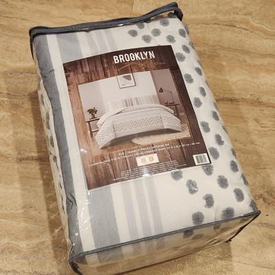 Modernize your bedroom with this tufted texture comforter set from Brooklyn Loom. The striped design features a soothing gradient of greys on an ivory background that are yarn dyed to ensure lasting, vibrant colors that won't fade after time. The soft, medium grey tufts add interest and texture to the face of this comforter and matching shams. The polyester material is durable and machine washable for easy care and maintenance.Includes one comforter (104"W x 90"L) and two king shams (20"W x 36"L)Product face and reverse is 100% yarn dyed polyester. Fill is 100% polyester with a weight of 220 GSM.This item is machine washable, but please be sure to use appropriate sized machinery to avoid any excess wear on the items.This item is manufactured and imported from China.