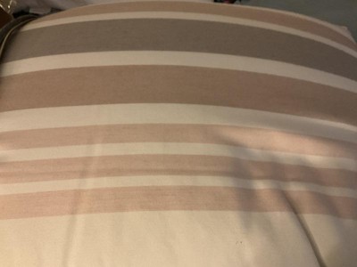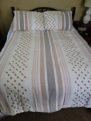 [This review was collected as part of a promotion.] I wasn’t sure if this pattern would be too feminine for my brother one side is striped on the other side has dots. It is really nice very soothing with a Beach and gray tones that are on the fabric. And it comes with 2 shams of course. Perfect for a Christmas present.