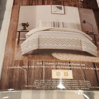 [This review was collected as part of a promotion.] Brooklyn Loom in style Mia Full/Queen Comforter with 2 pillow shams. 100% Polyester material is so soft and being washable and tumble dry is a plus. The natural backing color with muliple natural color stripes is perfect for any home decor type. The small added tufts bring a chic style for my much needed upgrad to my bedroom. Very happy with this comforter set.