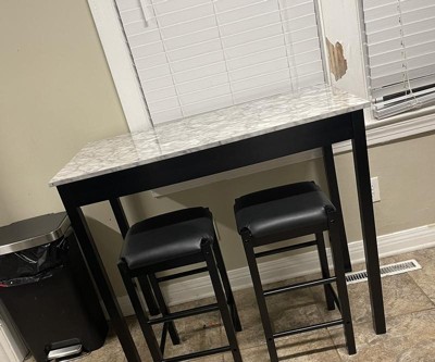 The Lancer 3-Piece Counter Height Tavern Table Dining Set is designed for space saving convenience. This set features an elegant rectangular table on long sturdy legs with two backless counter height stools with padded, black faux leather upholstered seats. Made from solid woods and a faux marble top. The black finish of the base and legs gives this piece an elegant and sophisticated appeal. The stools tuck neatly under the table when not in use. Great for kitchen, dining area, den or any place you entertain.