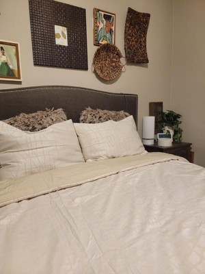 Beautiful comforter and sham set! Set unique off-white with shimmer color on the outside and beige on the inside. Very nice and classic set, will fit good most of the interiors. It’s on a thinner side, perfect for spring/summer. Set comes with two shams for queen size pillows. Definitely recommend.