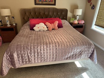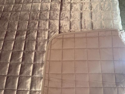 This is the most beautiful velvet coverlet I have ever had!! I love the simple quilting pattern. The charcoal color really is my favorite but I am thinking about purchasing another one, maybe the blush color. It is quite lightweight, perfect for now up to fall, but not winter unless u use it over blankets. It also comes with velvet shams. I love it! I would highly recommend,