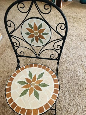 [This review was collected as part of a promotion.] This 3-Piece mosaic bistro set includes a round table and 2 matching chairs that are embellished with a beautiful Mosaic design. It's the perfect size for my meditation garden and it folds for easy storage. Well made and stylish, I absolutely adore this set!!