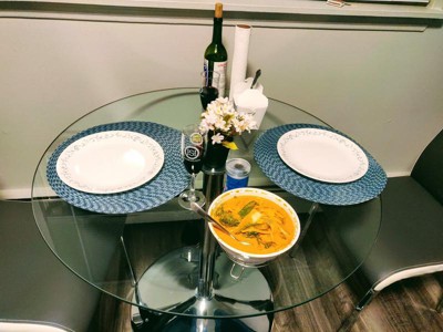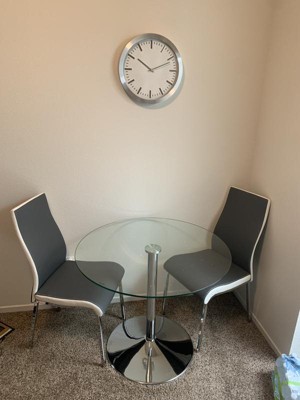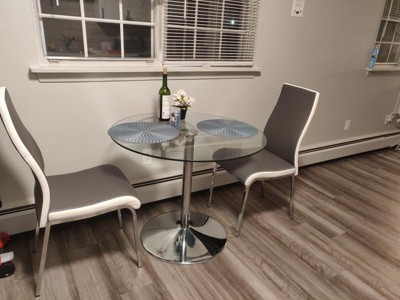 The 3pc Nora Dining Set from Buylateral is solidly contemporary in design. Sleek high back chairs with two-tone faux leather upholstery and the chrome plated legs and pedestal base accentuate the sleek lines of this set. A clear tempered glass top keeps everything light and bright making it a versatile dining set that coordinates well with many various color schemes. Maximum chair weight is 200 pounds. The products for household use only.