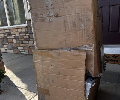 Product actually delivered a few days before it was supposed to, and we were not home. Box arrived damaged on the bottom, and the whole thing looked like it was retaped, like it was a rerun item. Pieces all came out of the box protected with foam wrap. However, there were a few dings and scrapes that we decided to live with. Assembly wasn’t too hard, it does take two people. Don’t tighten anything until it’s fully assembled, as the whole thing may be a bit out of square and require some tweaking. Welds and painted on worn edges are a little sloppy. One cushion was not as square as it should be. But chairs/cushions are pretty comfortable, and the set looks really good from a short distance.