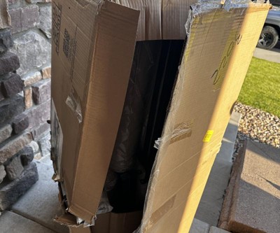 Product actually delivered a few days before it was supposed to, and we were not home. Box arrived damaged on the bottom, and the whole thing looked like it was retaped, like it was a rerun item. Pieces all came out of the box protected with foam wrap. However, there were a few dings and scrapes that we decided to live with. Assembly wasn’t too hard, it does take two people. Don’t tighten anything until it’s fully assembled, as the whole thing may be a bit out of square and require some tweaking. Welds and painted on worn edges are a little sloppy. One cushion was not as square as it should be. But chairs/cushions are pretty comfortable, and the set looks really good from a short distance.