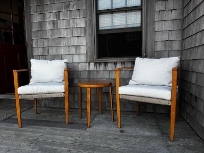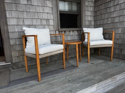 - Chairs have wicker-weave seat and back and come with loose cushions