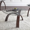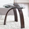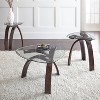 A contemporary mixed media set, Pitman features a sweeping bentwood base with unique triangular beveled glass tops. The interesting design has tremendous under-top visual appeal. A warm merlot cherry finish adds to the modern style of this very interesting table group. Your purchase includes one cocktail table and two end tables.