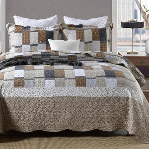 3PC Queen Quilt Sets with Shams, Navy and Brown Patchwork, Lightweight Reversible Bed Coverlet