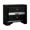 Attractive and alluring, this three-piece bed, dresser, and nightstand set is just what you need to create a peaceful sleeping quarters. Finished in a stunning black color, the panel bed boasts an intricately beautiful headboard with a shimmery silver stripe. At the footboard you'll find two storage drawers, perfect for tucking away small blankets. The matching seven-drawer dresser and two-drawer nightstand shares the same shimmery accent with hidden jeweler drawers.