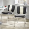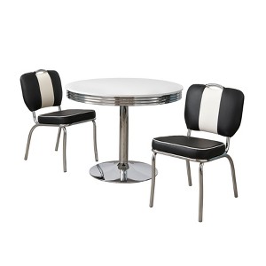 Go retro with the 3 piece Raleigh Retro Dining Set from Buylateral. This set of two chairs and one table will take your space back in time. Simplicity meets style with this white round table and chrome metal pedestal base, accented with a chrome metal band. Paired with padded two-tone chairs upholstered with faux leather available in black and white or red and white. These chairs are featured with a shiny chrome frame and legs, while its chair back is highlighted with chrome nailheads accented with an open back handle.