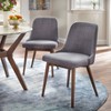 - Upholstered chairs in gray linen-look with contoured and padded seats; walnut finished legs