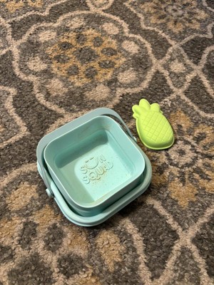 Finally a pail that is easy to transport. We live a few hours from the beach and I hate having to transport all the pails and beach toys, especially once they are full of sand. We are excited to take this soon. It folds down really small and is easily packed in the beach bag. Dirt rinses really easy off the pail which is a plus. The shovel and pineapple mold are also silicone and feel like they will hold up much longer than the traditional plastic beach toys. So excited for the next beach trip to use these on real sand!