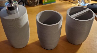 Sadly I am underwhelmed by this set. The set comes with a soap pump, cup and toothbrush holder. They are a neutral grey and white color and are very plain looking. The material gets scratched easily and the scratches are obvious. In my opinion, they just look cheap. I also noticed they have a smell to them. I am going to throw these in the guest bathroom. for now until I can find something cuter.