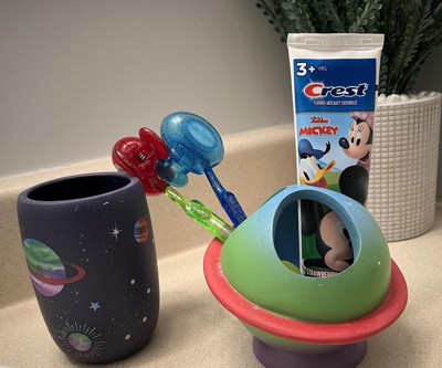- Graphic outer space themed 3-Piece Bath Accessory Set includes 1 ea.-Soap/Lotion Pump, Toothbrush Holder and Tumbler