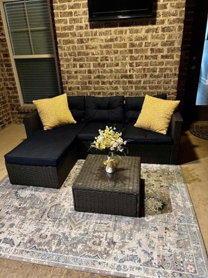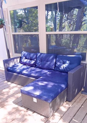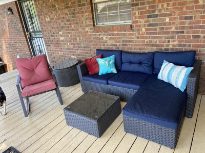 This set was just the right size for my small deck, almost, and the quality and color of the dark blue cushions and dark brown rattan were excellent. It took about 45 minutes to put together, so not as bad as some folks said. My only complaints are how low to the ground this is. We made a platform for it with 4 x 4 x 8 wood to raise it. Also the chaise part was shorter than I expected — I had envisioned napping here — so I used the table as an addition and added cushions that match. Overall, I love it — or will, when this darn winter ends!
