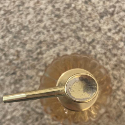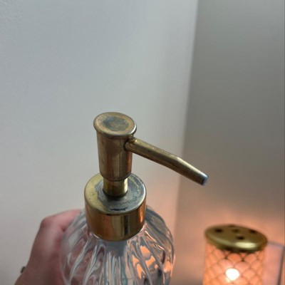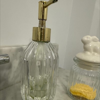 this set is soooo pretty. the glass is pretty thick and sturdy and i’ve dropped them a few times with no cracks or breaks. the gold paint on the metal soap pump does peel a little and it doesn’t look great, and the pump itself isn’t great. i really like foamy hand soap but this pump just kinda spits the liquid soap out.