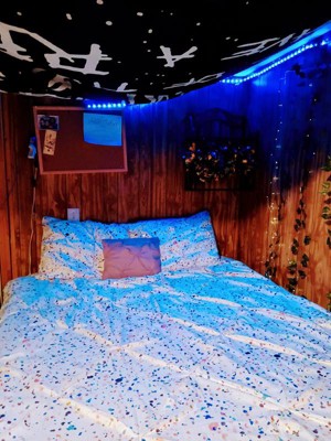 [This review was collected as part of a promotion.] I found this bedspread and just thought it was so pretty, it looks like someone took a paintball gun and shot different colors on the fabric, and it's so shiney the gold colors will shine under a blue light I have lights hanging this picture doesn't do it justice, but it looks really good and the best things about this cover set is it is so soft. I am so glad I found this. I haven't seen anything like this one before I just love it!!!!