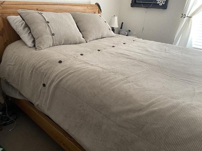 [This review was collected as part of a promotion.] This is a very pretty and unique neutral duvet set. It comes with one duvet cover (essentially insert a comforter into a washable sleeve) and two shams (extra large pillowcases). I got the king set and found the quality to be quite nice. It fully covered our mattress with the perfect amount of overhang. The corduroy texture is exactly what I imagined it would be-- think 1980's jumpers. It is medium soft and a great textured feel. I really like the simple detailing. It has just a touch of personality without being too much. It is perfect for a guest space as it is generally welcoming and inviting feeling.