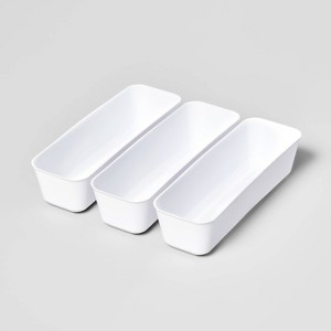 A: Hello K- We appreciate your interest in this 3pk Long Storage Trays. The official product specifications list the overall width as 3.36 inches. The product description mentions it has a “flared shape and open top”, which means the sides are angled outward toward the top instead of straight up and down. That means the bottom width will be narrower than the top opening due to the slight taper.- Auria