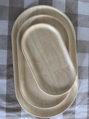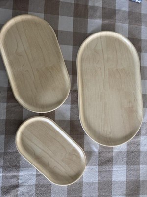[This review was collected as part of a promotion.] I love these melamine trays! These are advertised as decorative trays, but I love them for snack trays for my kids! I own melamine bowls, cups and plates. I have 3 kids so the different size plates are perfect for them. This definitely made snacking fun, and they are safe if dropped. I love the minimalist design and the look of wood. I will use these for decorative purposes around the house as well. These plates are so versatile, I highly reccomend! I received an incentive to write this review.