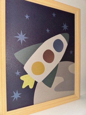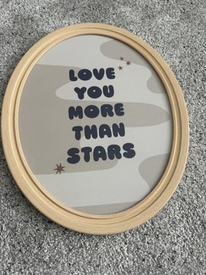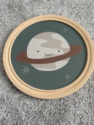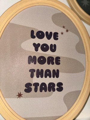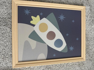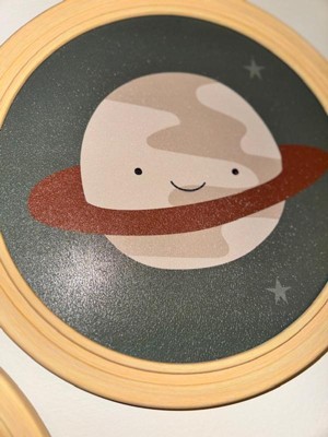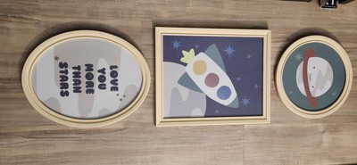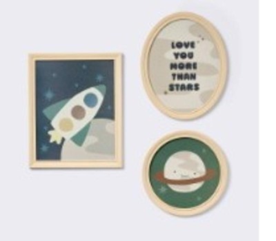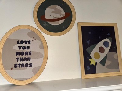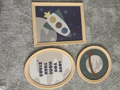Add cosmic style to your baby's nursery with this 3-Pack Space Framed Wall Art Set from Cloud Island™. It includes three space-themed art prints— a rectangular frame showcasing a vibrant spaceship, a round frame featuring a cute smiling Saturn and an oval frame with the message "Love You More Than Stars" — to brighten your little one's room with a touch of wonder. They're encased in cream-color frames for a neat look, and the frames have sawtooth backs for easy hanging.