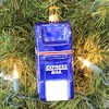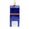 - A Mouth-Blown Glass Tree Ornament Of A Blue Mail Drop Box With A Red Stripe And White Glittered Stripe.
