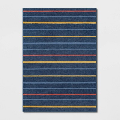 I love the Pillowfort brand so much, this rug I got from them is a perfect example why. The dimensions are 4 feet by 6 feet, just the perfect size for my son's room. The color is a gorgeous navy striped with white lines. The rug is comfortable to touch, I love that the height is just right to vacuum it nicely. I can see this rug going perfectly with cool to neutral wall color, as mine is light gray and let me tell you - they are so beautiful together.
