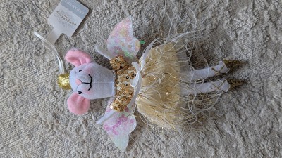 Add a dash of whimsy to your holiday tree with this 4.5-Inch Christmas Golden Mouse with Crown Ornament from Wondershop™. This fabric ornament features a white mouse with pink ears, sequined white wings, dressed as a ballerina, and sporting a gold-colored crown. It adds a festive touch to your decorations and also includes a hanging loop for easy placement on your tree.