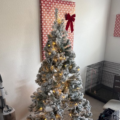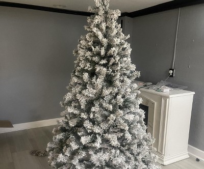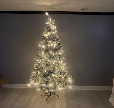 - Transform your space with this Pre-Lit Snow Flocked Christmas Tree featuring 100 warm white LEDs for instant holiday cheer! The realistic snow-dusted green tips create a cozy winter wonderland look, while the convenient foot pedal lets you control lights with a simple tap. You'll love how the hinged branches assemble in minutes - just unfold, fluff, and enjoy a perfectly decorated tree. The sturdy metal stand keeps it stable in any room, making it ideal for apartments, entryways, or as a charming second tree