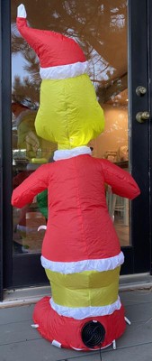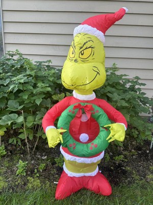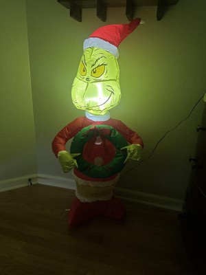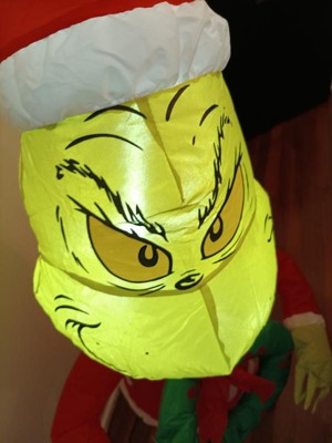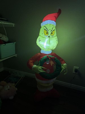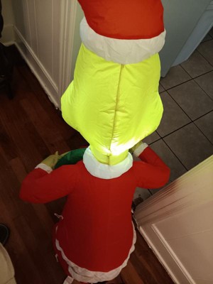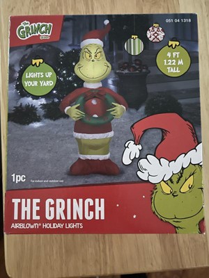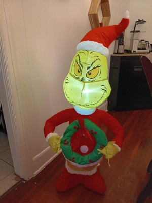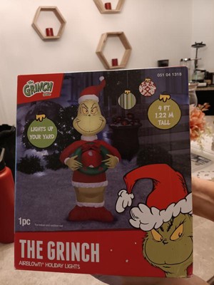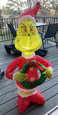This Grinch is pretty cool and brings back so many great memories from my childhood days. Standing at 4 feet tall and dressed as Santa holding a freshly acquired wreath and I have no doubt the Christmas tree is in his sights as well judging by the mischievous look in his yellow eyes. His hands don't really look right and they don't really seem to want to inflate, but thats about the only negative I see about him. He blows up quickly. The light inside really help bring him to life. He is a great decoration for both indoors and outdoors. All in all, if you are a fan of all things Grinch, this will not disappoint!