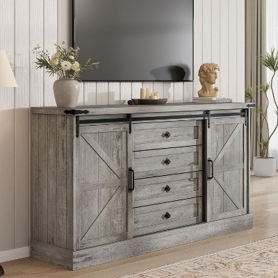 Farmhouse 4 Drawer Dresser for Bedroom, 59" Wood Dressers with Sliding Barn Doors, TV Stand with Large Drawers and Bar Handles, Dressers and Chests of Drawers for Closet,Living Room.Farmhouse 4 Drawer Dresser for Bedroom, 59" Wood Dressers with Sliding Barn Doors, TV Stand with Large Drawers and Bar Handles.Farmhouse 4 Drawer Dresser for Bedroom, 59" Wood Dressers with Sliding Barn Doors, TV Stand with Large Drawers and Bar Handles