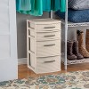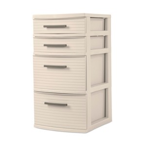 Elevate your home organization with the Brightroom™ Medium 4 Drawer Tower. Designed for vertical storage, this durable plastic tower features four opaque drawers, two shallow and two deep, that help conceal clutter while keeping a polished appearance. Its sleek profile offers practical capacity while maintaining a streamlined design that blends easily into living spaces. Ideal for lightweight storage needs — such as office supplies, accessories, or craft materials — keeping items easily accessible and within reach for daily use. This drawer tower adds a decorative touch while keeping everyday spaces neat, tidy, and organized. The overall assembled dimensions of this item are 15" D x 12 5/8" W x 24" H.