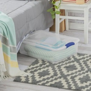 - Step up to 's versatile 32 Quart Clear Latching Storage Bin and get organized! The clear base and lid let you easily view and locate stored contents from any angle. The color accent latches keep the lid attached to the base, keeping items contained. The recessed lids help bins stack to efficiently use vertical space. This size plastic storage container is perfect for linens, towels, and seasonal clothing, and fits neatly underneath beds to optimize storage space. This is the ideal solution for a variety of storage challenges, helping to bring order to closets, bedrooms, craft rooms, and dorms!