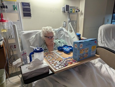 This set has sturdy pieces & is small enough to fit on a hospital tray table. It worked well for my elderly mother. The only con is that there is no large completed picture/poster to refer to. The small pictures on the box are hard to see.
