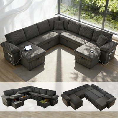 4-Seater Corduroy Fabric Folding Convertible Sofa Bed with Side Storage Pockets, Cushions Included, Space-Saving for Living Room, Bedroom, and Study