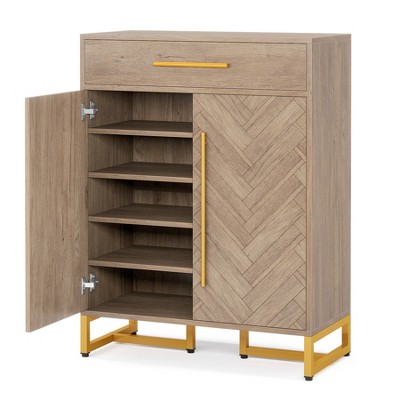 4-Tier Shoe Cabinet 1 Drawer 2 White Doors Adjustable Shelves Freestanding Entryway Hallway, Natural, 31.49"*15.74"*39.4"