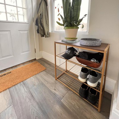 - Brass-finish metal shoe rack with walnut wood top makes a sleek addition to your home