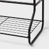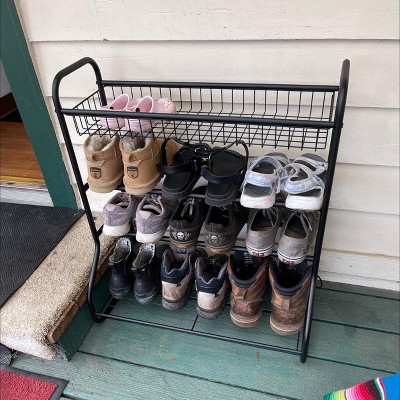 This 4-Tier Shoe Rack with Basket from Brightroom™ is perfectly sized to hold 12 pairs of shoes and accessories neatly and within reach. Made from steel, this rack features one top basket shelf, two small shelves, and one larger bottom shelf for boots or taller items. Once assembled, place it freestanding in a closet or near an entryway for quick access to your favorite footwear as you head out the door.