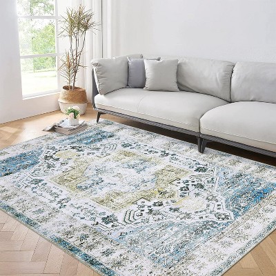 4'x6' Machine Washable Runner Rug, Non-Slip Low Pile Carpet for Hallway, Bedroom, Living Room, Kitchen, Dining Room, Blue