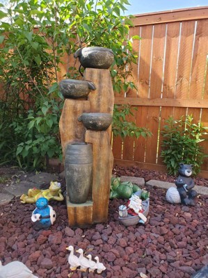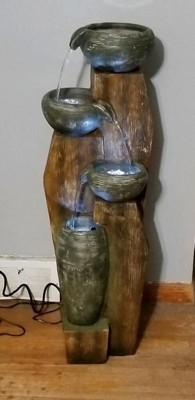 [This review was collected as part of a promotion.] I put this in the corner of my back deck and now I wonder how I did without it! It is made of a form of plastic but looks like read wood. The fountain has a hideaway for the plug when it in use also so it is not dangling off my deck. The colors are so realistic and the way the water flows from bowl to bowl in cascading action makes it sound like a stream running! I absolutely love this!❤️❤️❤️