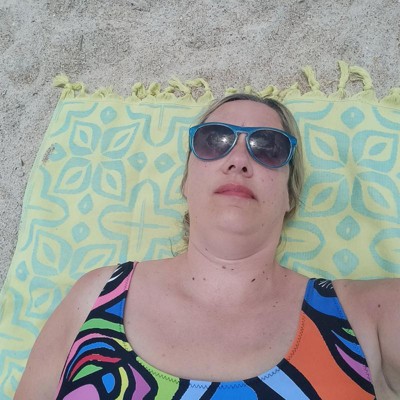 This beach towel is beautiful. The cheery yellow is accented by the blue design. It's a very soft fabric, lightweight and perfect for the beach. The tassels make it unique. I will be showing off this awesome towel at my next beach outing or vacation to Puerto Rico.