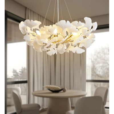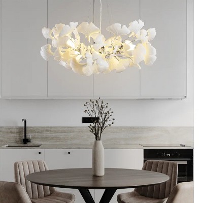 Introducing the exquisite Ginkgo Leaf Dining Room Chandelier, a perfect blend of iron and ceramic, meticulously adorned with a sophisticated electroplated finish. A testament to opulence and sophistication, this chandelier elevates your dining environment to unparalleled heights. With its thoughtful design, it bathes your space in a warm 3000K glow, perfectly creating an ambience conducive to an exceptional dining experience.