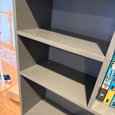 - Features a multi-level bookshelf with five open compartments