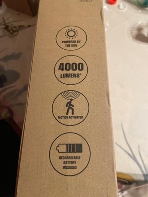 [This review was collected as part of a promotion.] I receive the 4000 lumen solar area light it works great it has a good quality brightness and clear the installation was easy to assemble the durability of the lumen looks very good quality it’s weather resistant and has good coverage everything it’s great works very good and it’s solar recharge no connection no batteries needed I recommended it’s perfect for outside far places it bright a lot and it detect people it has a button if you want it off or on