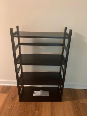 Great solid wood bookshelf. Easy to assemble by myself. Very dark color, almost black, which I like. I'm not using the wall anchor (no young kids), and it seems sturdy. I would recommend!