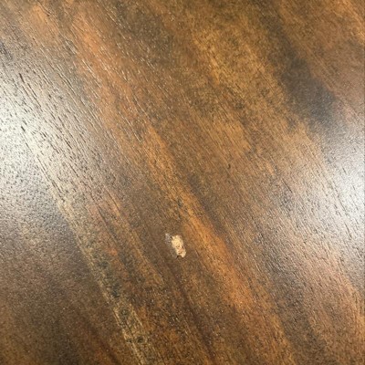 Table top is not acacia wood. It is particle board with a laminate faux wood finish. Table top arrived with a screw popping through the top and particle board can be seen through the hole. Returning to Target.