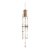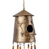 - •This bronze rustic style wind chime highlights a bird house-inspired design with a round opening and botanical pattern and comes with hanging bead, bird, cone, and house embellishments