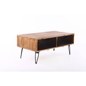 The Lindsay Reclaimed Wood 42" Foldable Coffee Table with Wire Mesh Drawers will add functional charm to any space. This cocktail table features reclaimed wood construction in a natural finish with black iron hairpin legs, instantly exuding an industrial yet rustic flair. A lacquer finish ensures long lasting protection and durability. The sturdy metal legs conveniently fold to allow for easy portability and storage. Two included wire mesh drawers easily slide into the two compartments creating plenty of storage space. Pair with the matching Franklin 60" TV Stand or Owen 48" TV Stand or Turner Reclaimed Wood Foldable End Table (available and sold separately) for a chic, cohesive look.