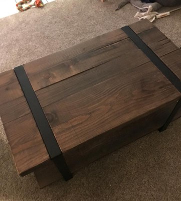 I am in love with this coffee table! I love the rustic look and the quality is above and beyond what I expected. I was pleasantly surprised to find that it is made of real solid wood, including some reclaimed wood. Assembly was simple and took around 30 minutes. Of note, the color is slightly darker than shown.